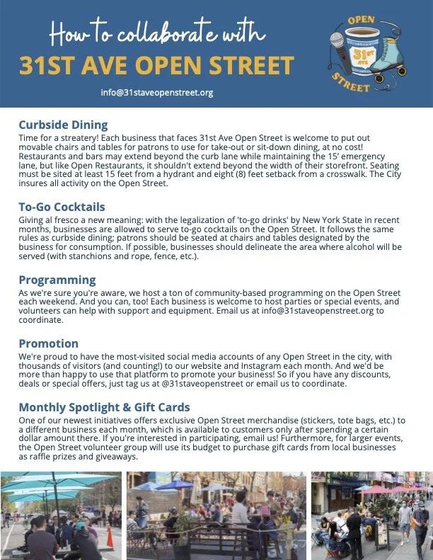 The 31st Avenue Open Street is a Temporary Full Closure, meaning that all motor vehicle traffic is prohibited, including local pickups and parking. For everyone’s safety, please refrain from entering the Open Street with your car between the hours of 12pm and 8pm. If you are visiting a local business, you may use the areas adjacent to the crosswalks on 31st Avenue as a 15-minute temporary loading zone. For longer visits, free street parking can be found on 33rd, 34th, and 34th Streets, and there are municipal lots at 31st Street & Broadway, Steinway Street between Broadway and 31st Avenue, and 30th Avenue & 38th Street.